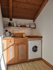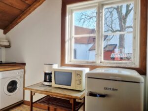 Lägenheten är 29 kvm stor och erbjuder två enkla sängar på 90 cm som kan ställas bredvid varandra till en dubbelsäng. Dessutom finns en bäddsoffa med plats för upp till två barn (sovyta 130 cm). Det finns ett litet pentry för enklare matlagning. Det finns också ett litet arkitektritat badrum med dusch.