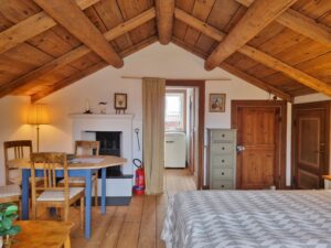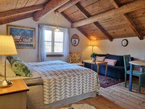 Huset är av typen loftbod i två våningar. Som gäst får du tillgång till lägenheten på övre våningen, som troligtvis fungerat som magasin förr i tiden, genom en svalgång på utsidan av huset.